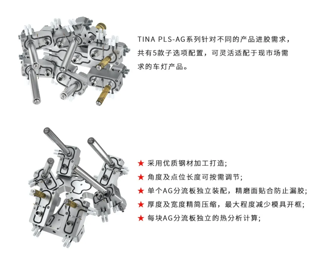 TINA PLS-AG series hot runner systems focus on adapting to products and molds such as headlight masks/deep cavity lamp holders that require normal angled gluing on the product surfaceโ€โ€โ€โ€โ€